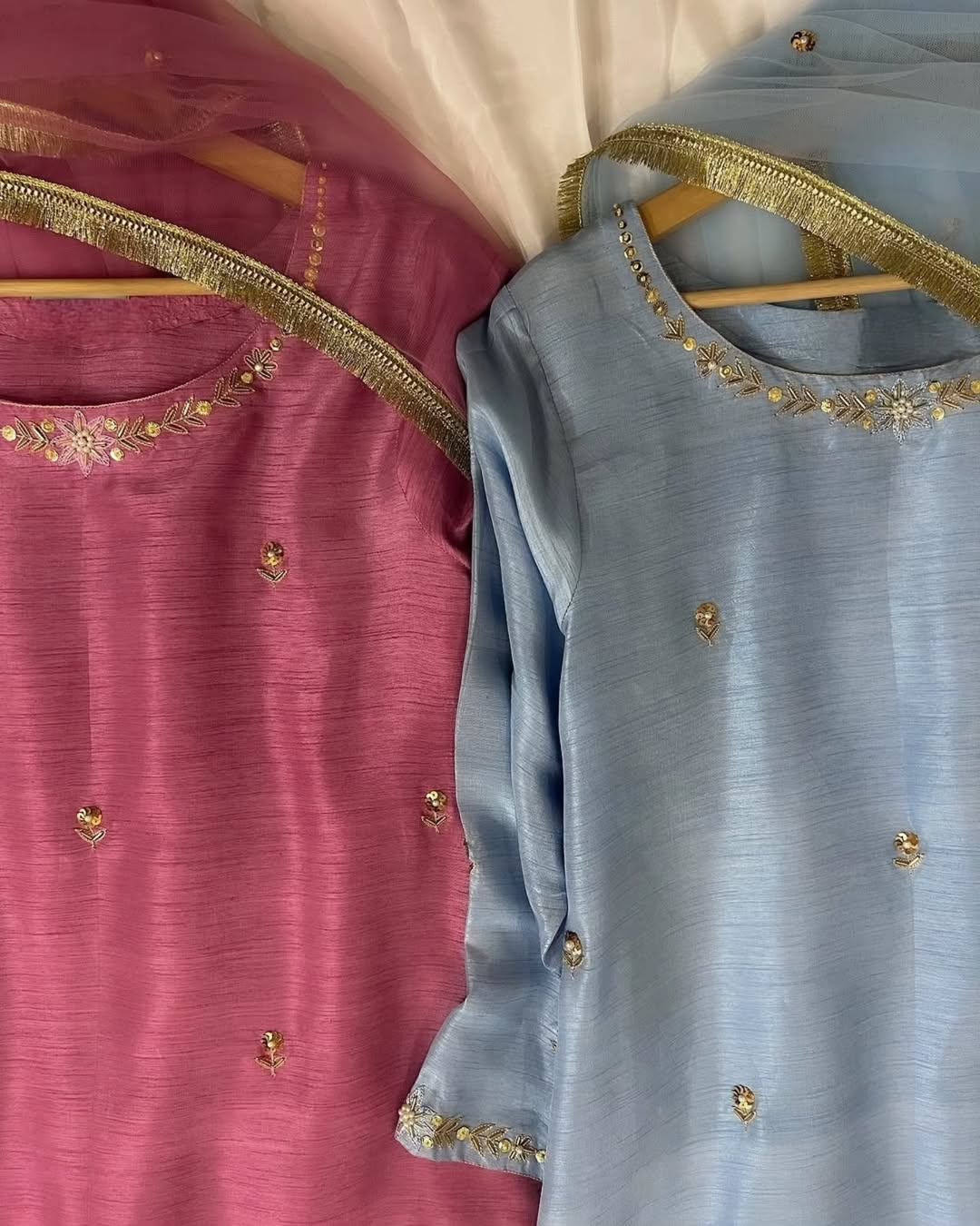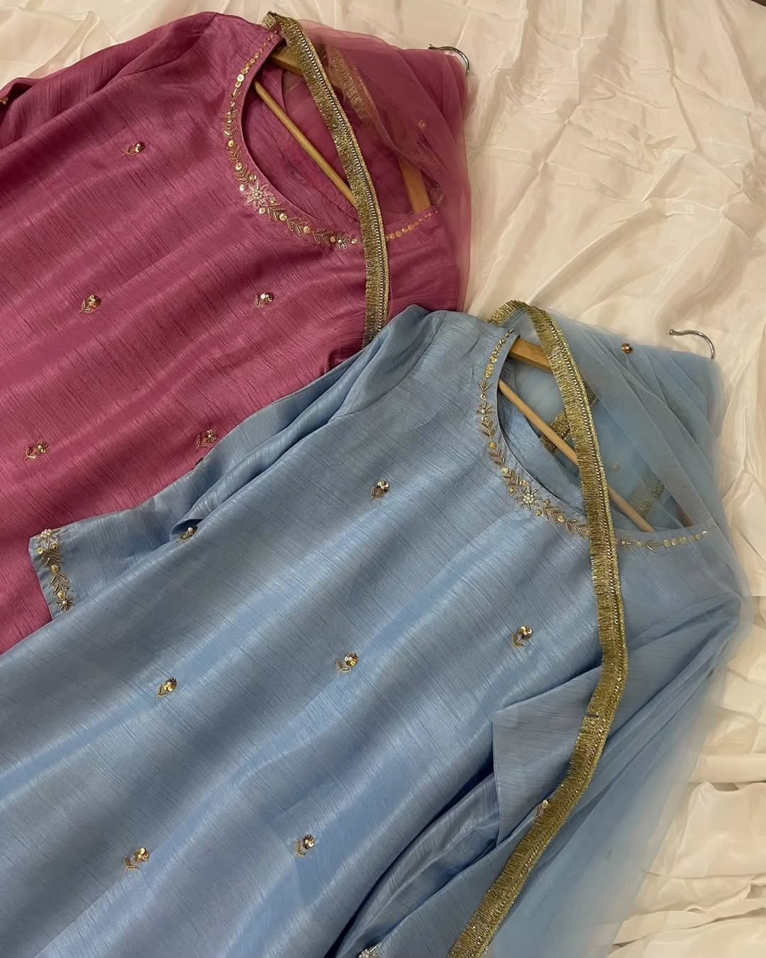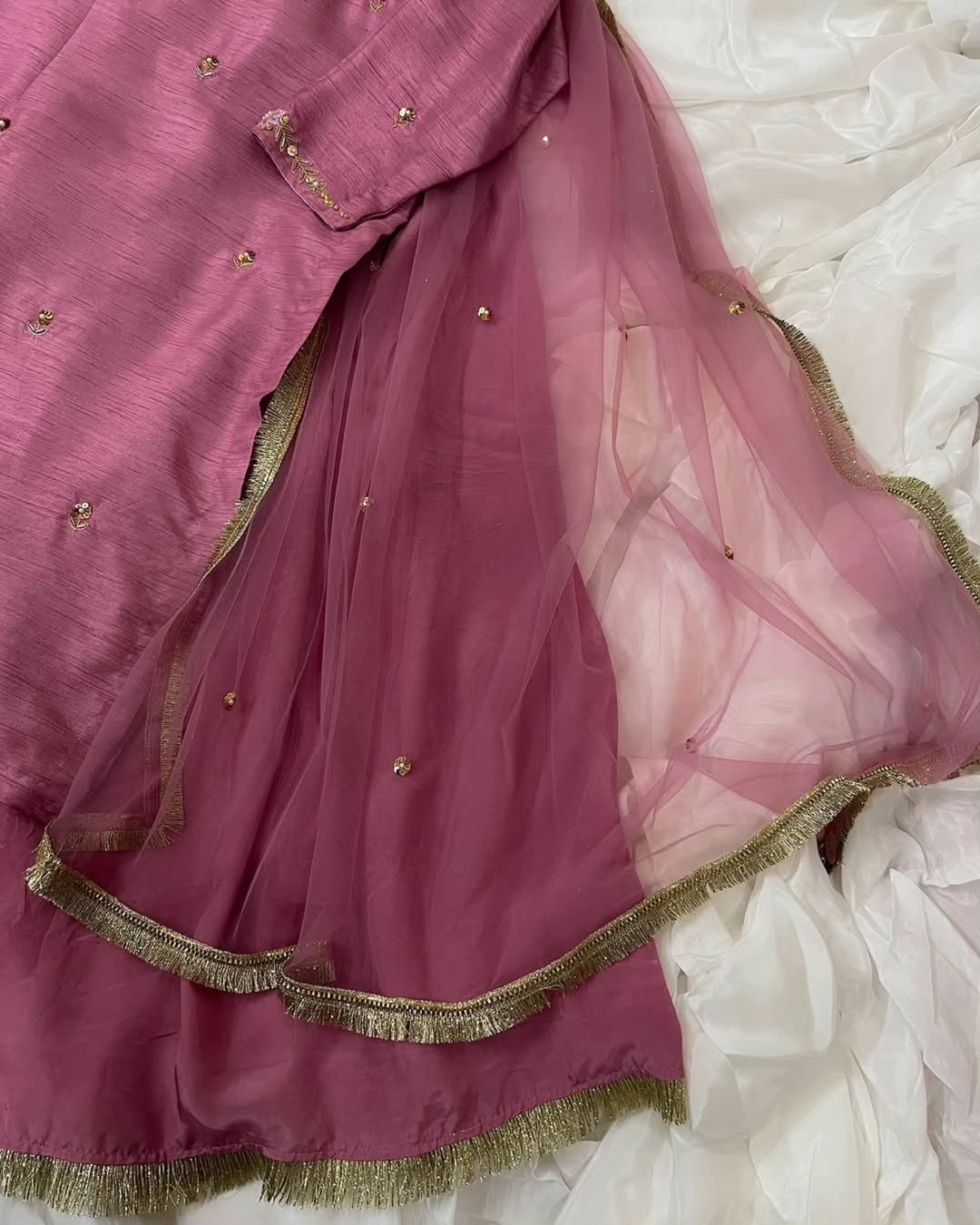 This 3pc ensemble features luxurious rawsilk fabric and a delicate organza dupatta. Handmade with exquisite detail, it exudes elegance and charm. Elevate your style with this beautiful piece.