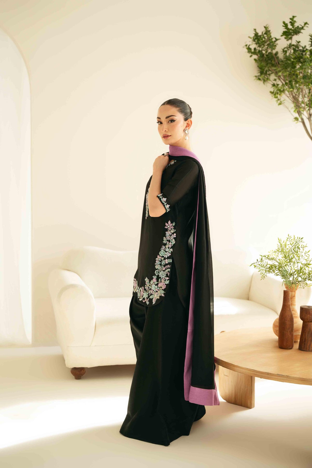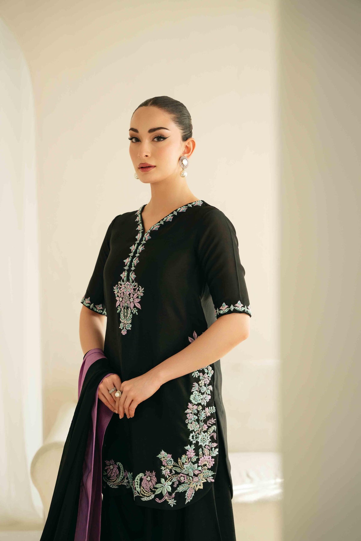 Hand embroidered base with embellishment of pearls, crystals, Katdana in monotones of lilac and ice blue.